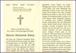 Eltern: Engelbert Rünz u. Elisabeth geb. Hommer; ∞ 30.7.1925 in Grimlinghausen Anna-Maria Frings; 2 Töchter; Soldat im 2. Weltkrieg, aus dem er leidend zurückkam; Wiederaufbau seines früheren Geschäftes |
