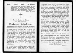 landwirt; Eltern: Peter Josef Kalscheuer u. Cäcilie geb. Thoennes; verlor Vater mit 12 J.; ∞ Juli 1923 Agnes Irnich, † 17.8.1932; ∞ 12.10.1933 Christine Wenzeler aus Heppendorf; 1 Sohn; Mitgl. Kirchenvorst. (Buir) |