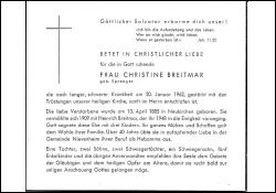 Lange, schwere Krtankheit; ∞ 1909 Heinrich Breitmar, † 1948; 3 K.; mehr als 40 J. Hebamme in der Gemeinde Nievenheim |