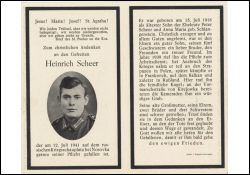 Gefallener 2. Weltkrieg; Eltern: Peter Scheer u. Anna Maria geb. Schlangenstein; 1939 RAD; bei Kriegsausbruch Einsatz in Polen, dann Frankreich, dann Balkan, zuletzt Russland; Grab an der Vormarschstraße von Kirejowka; Druck in Dormagen |