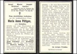 Eltern: Peter Josef Schieffer u. Walburga geb. Steins; ∞ 17.5.1879 Mathias Pöttgen; 14 K., davon 5 †; Druck in Grevenbroich |