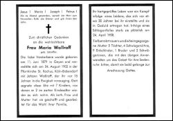 Schlaganfall; ∞ 24.8.1902 in Köln-Bickendorf, St. Rochus, Johann Wallraff, vor 15 J. †; 7 K., davon 2 früh †; seit 30 J. leidend |