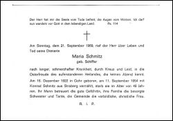 Lange, schmerzhafte Krankheit; ∞ 11.9.1954 Konrad Schmitz aus Straberg |