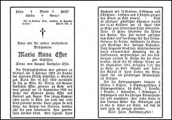 Eltern: Matthias Schlösser u. Gertrud geb. Marx; ∞ 16.7.1885 in Köln (St. Moritz) Kaspar Balthasar Effer, geb. 12.9.1859 in Gohr als Sohn v. Franz Effer u. Gertrud geb. Beyen; beide lebten zuerst in Köln, dann Gohr; 12 K., davon 7 †; Ehemann † 15.4.1926 in Gohr; längeres Siechtum |