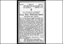 Eltern: Gerhard Albers u. Christina geb. Peters; ∞ 14.5.1884 Wilhelm Saat aus Keeken, † vor 24 J.; 8 K., davon 5 †; |