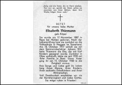 Nach der Lehrerprüfung Lehrerin in Heggen, Sauerland; ∞ 18.10.1917 Seminaroberlehrer Johann Wilhelm Thiemann, † 15.10.1943; 5 K.; wohnte zunächst in Olpe, seit 1928 in Buer |
