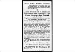 ∞ 7.2.1878 Theodor Teusch, † 10.2.1927; 7 K., davon 2 Söhne im 2. Weltkrieg gefallen u. 1 Tochter mit 22 J. †; Wohnort: Hupperath |