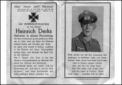 Gefallener 2. Weltkrieg; Eltern: Johann Derks u. Cornelia geb. Pelser; Okt. 1941 RAD, April 1942 Soldat, seit April 1943 an der Ostfront; Druck in Emmerich |