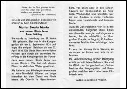 9.9.1924 Eintritt in die Kongregaqtion der Schwedstern vom armen Kinde Jesu; 22.4.1930 Ewige Gelübde; Leiterin des Kindergartenseminars in Köln-Ehrenfeld; Oberin in Neuss-Marienberg; Mutter in den Kinderhäusern zu Köln-Kalk, Wachendorf u. Ateinfeld; Generaloberin; schließlich in Bogotá, Kolumbien |