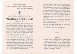 Eltern: Peter Schönheit u. Wlilhelmine geb. Kaiser; Priesterweihe Köln 18.8.1910; 1910-13 Vikar in Jüchen; 1913-17 Parr-Rektor an St. Antonius (heute St. Bruno) in Düsseldorf-Unterrath; 1917-29 Pfarr-Rektor in Duisburg-Rahm; 1929-49 Pfarrer in Bedburdyck; 1949-50 Pfarrer in Eicks; danach Ruhestand |