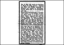 Gefallener 2. Weltkrieg; tätig beim Fernsprechamt; 17.11.1939 Einberufung zur Wehrmacht; 1 Bruder schwerkriegsverletzt, ein weiterer Bruder Soldat; |