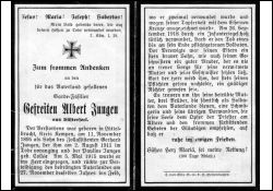 Gefallener 1. Weltkrieg; Eltern: Zollassistent Gerhard Jungen, † 2.8.1911, u. Pauline geb. Collée; Einberufung 5.5.1915, am 27.11. ins Feld; zweimal verwundet; Wohnort: Süsterseel; Druck in Geilenkirchen |