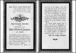 ∞ 29.7.1849 Peter Jungen;, † 4.7.1883; 9 überlebende Kinder; Wohnort; Brühl |
