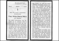 Eltern: Michael Kempen u. Margareta geb. Virnich; ∞ 23.10.1890 Friedrich Wilhelm Marx aus Dansweiler, † Nov. 1941; 8 K., davon 4 †; Goldhochzeit 1940; nach Unfall längeres Leiden |