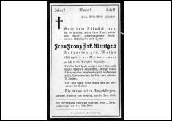 Schlaganfall; ∞ Franz Jakob Mentges; Mitgl. Mütterverein; Wohnort: Wehlen |