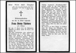 ∞ 1936 Friedrich Thiebes; 2 K., davon 1 mit 3 J. †; ihr Vater, lahm u. erblindet, den sie gepflegt hatte, † vor wenigen Wochen; Operation schien glücklich verlaufen |
