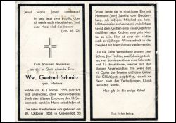 55 J. Ehe mit Hermann-Josef Schmitz vom Geddenberg (Bedburg/Erft), vor 2 J. †; 9 K.; Mitgl. Mütterverein; Druck in Bedburg |