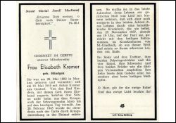 ∞ 10.5.1910 Anton Kremer aus Gustorf; 5 K., davon 3 Söhne im 2. Weltkrieg gefallen; 1 Schwiegersohn vermisst; Gatte † durch Kriegseinwirkung am 28.2.1945 in der Heimat; in den letzten Jahren heimtückische Krankheit; Druck in Bedburg/Erft |