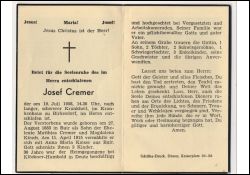 Eltern: Matthias Cremer u. Magdalena geb. Kirsch; ∞ 11.4.1915 Anna Maria Kaiser aus Buir; 3 K.; 30 J. b. Klöckner-Humbold in Deutz beschäftigt |