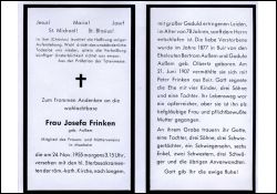 Mitgl. Frauen- u. Mütterverein Manheim; langes Leiden; Eltern: Bertram Außem u. Gudula geb. Olbertz; ∞ 21.6.1907 Peter Frinken aus Buir; 4 K. |