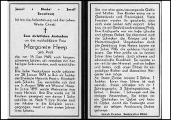 Eltern: Heinrich P∞k u. Elisabeth geb. Schmitz; ∞ in Buir 5.8.1896 Winand Heep; 1897 Umzug nach Weisweiler; 14 K., davon 9 früh †, 1 Sohn im 2. Weltkrieg gefallen; Heim im 2. Weltkrieg zerstört; Goldhochzeit 1946; 1 Sohn noch im 2. Weltkrieg vbermisst; Druck in Eschweiler, Rhld. |