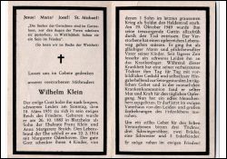 Eltern: Franz Klein u. Anna Margarete geb. Broich; ∞ 22.2.1914 Margarete Odenhoven, † 19.10.1949; 4 K., davon Sohn im 2. Weltkrieg gefallen; seit längerem schweres Leiden, ans Bett gefesselt; |