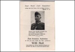Gefallener 2. Weltkrieg; am 8.7. schwer verwundet; Heldenfriedhof Cholm; Eltern: Johann Moll u. Emma geb. Seidelmann; ∞ 21.2.1939 Gertrud Alles aus Heinsberg; 1 Sohn; als Soldat in Norwegen; seit Dez. 1943 im Osten; sein Vater war im 1. Weltkrieg gefallen; ; Druck in Heinsberg |