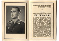 Gefallener 2. Weltkrieg; Opfer eines Eisenbahnunglücks; Heldenfriedhof Taganrog; Eltern: Peter Pohl u. Margareta geb. Neustein; Jugendzeit b. Onkel in Buir; Bäckerhandwerk; RAD März 1938; dann Wehrmacht; Einsatz in Nordfrankreich u. Griechenland; Juli 1941 Ostfront; ∞ 21.8.1937 in Elmshorst, wo er Landjahr verbracht hatte, Emmy Schmidt; 2 K., davon 1 †; |