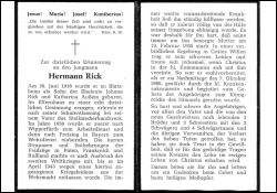 Opfer 2. Weltkrieg; Eltern: Johann Rick u. Katharina geb. Außem; erlernte beim Vater das Stellmacherhandwerk; 1938 RAD, dann zur Wehrmacht; Einsatz in Polen, Frankreich, Russland; wegen Kriegsleidens im April 1943 aus der Wehrmacht entlassen; war zunehmend auf Hilfe angewiesen; Mutter † 19.2.1960 |
