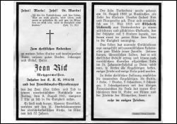Metzgermeister; Eltern: Theodor Hubert Rick u. Margaretha geb. Bins; Soldat im 1. Weltkrieg; ∞ 17.5.1923 Elisabeth Lückerath aus Breitenbenden; 2 K., davon 1 früh †; Druck in Euskirchen |