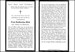 Eltern: Heinrich Außem u. Anna Maria geb. Franken; ∞ 20.10.1907 in Bottenbroich Johann Rick; 10 K., davon 2 Töchter als Kinder †; 1911 zog die Familie nach Blatzheim, wo der Mann sein Stellmachergeschäft aufbaute; Sohn Johann im 2. Weltkrieg am 28.9.1942 in Russland gefallen; Sohn Hermann kam leidend aus dem Krieg zurück und war auf ihre Fürsorge angewiesen; |