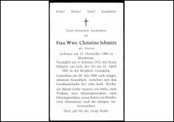 Lange, schwere Krankheit; ∞ 4.2.1912 Franz Schmitz aus Lich, † 21.4.1921; überlebende Kinder |