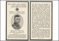 Gefallener 2. Weltkrieg; Eltern: Peter König u. Maria geb. Rick; Jugend in Bottenbroich; Nov. 1938 zum Heeresdienst; ∞ 5.2.1940 Maria Linzmaier aus Etzweiler; 1 Sohn; als Soldat 1940 in Holland, Belgien, Frankreich; 1941 im Osten; Druck in Frechen |