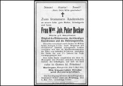 49 J.; längeres Leiden; ∞ Johann Peter Becker, † vor 2 1/2 J.; Kinder; Druck in Wittlich |