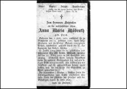 Langjähriges Leiden; 47 J. Ehe mit Heinrich Mödrath, † 20.3.1895; 5 überlebende Kinder |
