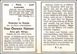 ∞ 21.4.1902 Gereon Hansen, im 1. Weltkrieg am 26.4.1914 b. Rippont gefallen; 5 K., davon 2 †; lebte 34 J. als Witwe; Mitgl. Mütterverein; Druck in Hückelhoven |
