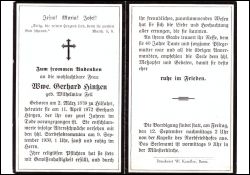 ∞ 11.4.1872 Gerhard Hintzen, † vor 2 J.; 40 J. Pflegemutter für ihren Neffen; Druck in Bonn |