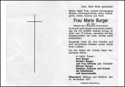 75 J.; Mitgl. Lebendiger Rosenkranz; langes, schweres Leiden; Ehemann: Karl Burger; Kinder; Druck in Bitburg |