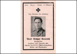 Gefallener 2. Weltkrieg; Eltern: Johann Geuenich u. Gertrud geb. Schlang; am 12.2.1940 einberufen; eingesetzt auf dem Balkan, Kreta, Afrika, Sizilien, zuletzt im Westen; Wachtmeister; Druck in Bergheim/Erft |
