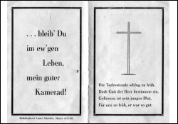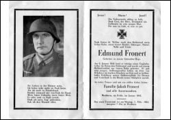 Gefallener 2. Weltkrieg; 35 J.; Tod durch Unglücksfall; Wohnort: Weibern; Vater: Jakob Fronert; Druck in Mayen |