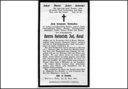 Eltern: Heinrich Keul u. Magdalena geb. Schmitz; ∞ 14.2.1929 Mary Vendel; ; sein Bruder † vor 8 Monaten; Druck in Adenau |