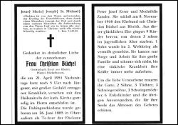 Längeres Leiden; Eltern: Peter Josef Esser u. Mechtildis geb. Zander; ∞ 8.11.1908 Christian Büchel aus Rheidt; 9 K., davon 3 jugendl. †, 1 Sohn im 2. Weltkrieg vermisst; |