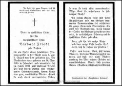 Opfer 2. Weltkrieg, Tod bei Luftangriff in der Nacht 1./2. August; ∞ 1931 Andreas Friedt; 1 K.; Druck in Bergheim/Erft |