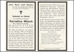 Gefallener 2. Weltkrieg; Eltern: Johann Münch u. Maria Katharina geb. Schäfer; Tischerhandwerk; Einberufung 25.11.1940; dreimal im Osten verwundet; danach Einsatz im Westen; Druck in Lechenich |