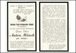 79 J.: langes Leiden; ∞ 24.10.1887 Anton Münch aus Friesheim, † 27.3.1911; 8 K., davon 3 früh †; Druck in Lechenich |