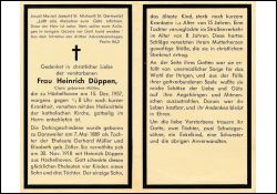 Eltern: Gerhard Müller u. Elisabeth geb. Zöller; ∞ 30.11.1918 Heinrich Düppen aus Hüchelhoven; 4 K., davon der einzige Sohn † mit 15 J.; 1 Tochter verunglückte mit 8. J. im Straßenverkehr; |