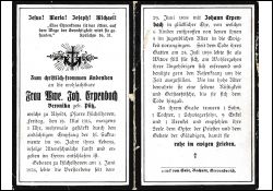 ∞ 29.6.1858 Johann Erpenbach, † 24.7.1898; 6 K., davon 4 jugendl. †; Druck in Grevenbroich |