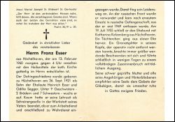 Eltern: Heinrich Esser u. Odilia geb. Segger; Schreinerlehre beim Vater; im 2. Weltkrieg an der Ostfront verwundet; bis 1949 in russischer Kriegsgefangenschaft; ∞ 19.7.1955 Katharina Kelzenberg aus Hüchelhoven; 1 Tochter; Kriegsleiden durch nicht entfernten Granatsplitter im Kopf; es führte schließlich zum Tod (Opfer 2. Weltkrieg) |
