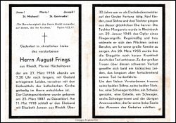 ∞ 11.5.1918 Elisabeth Jansen aus Rheidt, † 28.3.1955; über 30 J. Dachdeckermeister auf der Grube Fortuna; 5 K.; davon Tochter Margareta am 29.1.1945 in Rheinbach Opfer eines Fliegerangriffs geworden; Druck in Bergheim/Erft |