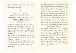 ∞ 28.6.1914 Karl Fink, † vor 2 J.; 5 K., davon früh †, 2 Söhne im 2. Weltkrieg gefallen; seit 1953 schwere Krankheit; |